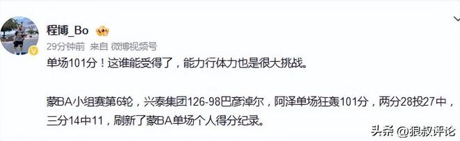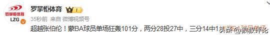 博主罗掌柜体育发文点评:超越张伯伦!蒙BA球员单场狂轰101分,两分28投27中,三分14中11。