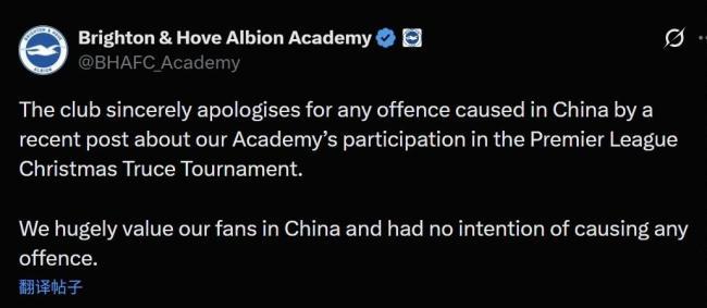声明称,布莱顿俱乐部就近期一则关于青训学院参加英超圣诞休战活动的帖子在中国造成的任何冒犯致以诚挚的歉意。